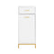 De elegante linjer i det hvide skab kombineret med den kontrasterende guldmetalramme skaber et moderne og stilrent design, der passer perfekt ind i ethvert badeværelsesmiljø.